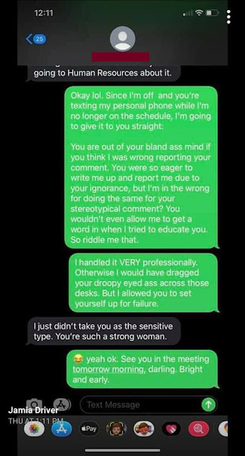 Even after apologizing and disregarding the write up, Karen tries to smooth over her racist comment of "those kinds of people" but Ms Jamia Driver is NOT having it. What happens next is mind numbing